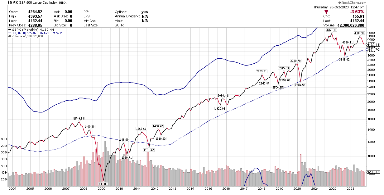 There was a short period at the end of March 2020 when the Bollinger Band was breached, indicating a sell. However, by that time, the markets were already moving up from the mid-March low very strongly, so one can assume that an astute investor would not have sold everything. (However, if one had sold upon the Bollinger Band breach, results for 2020 would have deteriorated considerably, from +18.37% to +2.43%, knocking down long-term compounded results by another half percent).