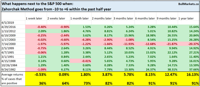 Here’s what happens next to the S&P 500 when the Zahorchak Method goes from -10 to +6 within the past 6 months.”