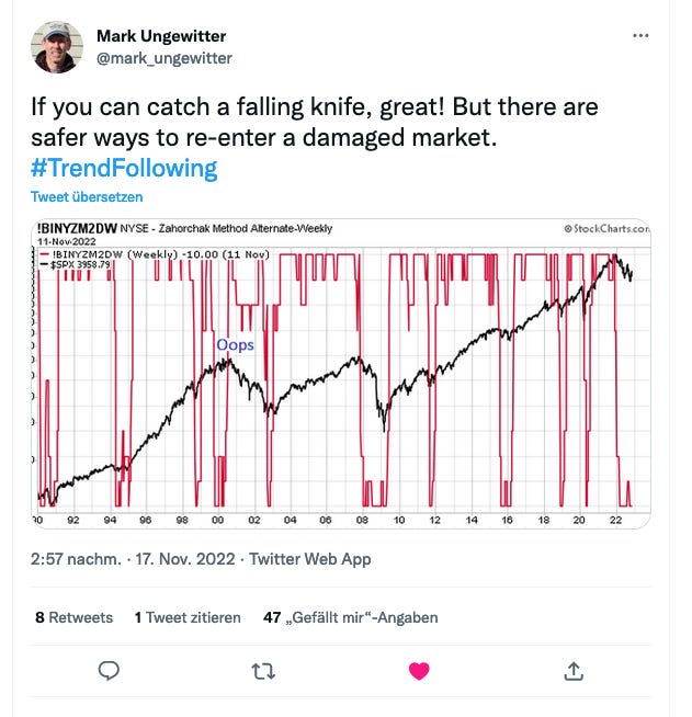 Typically for momentum indicators, it also performed unsatisfactorily during the Covid crash, telling you to sell in April 2020, while the market was already recovering. The Zahorchak sell signal should probably be ignored until confirmed by a tight moving stop, to prevent this kind of nonsense.