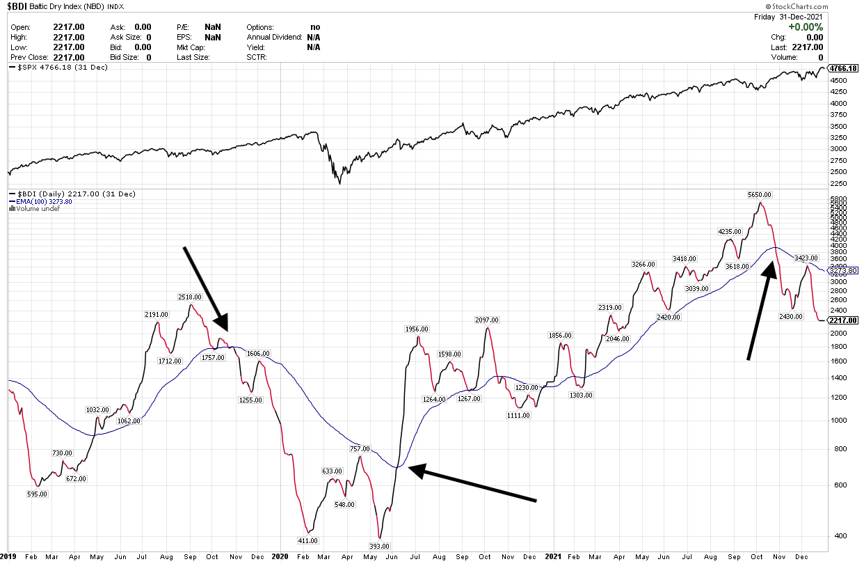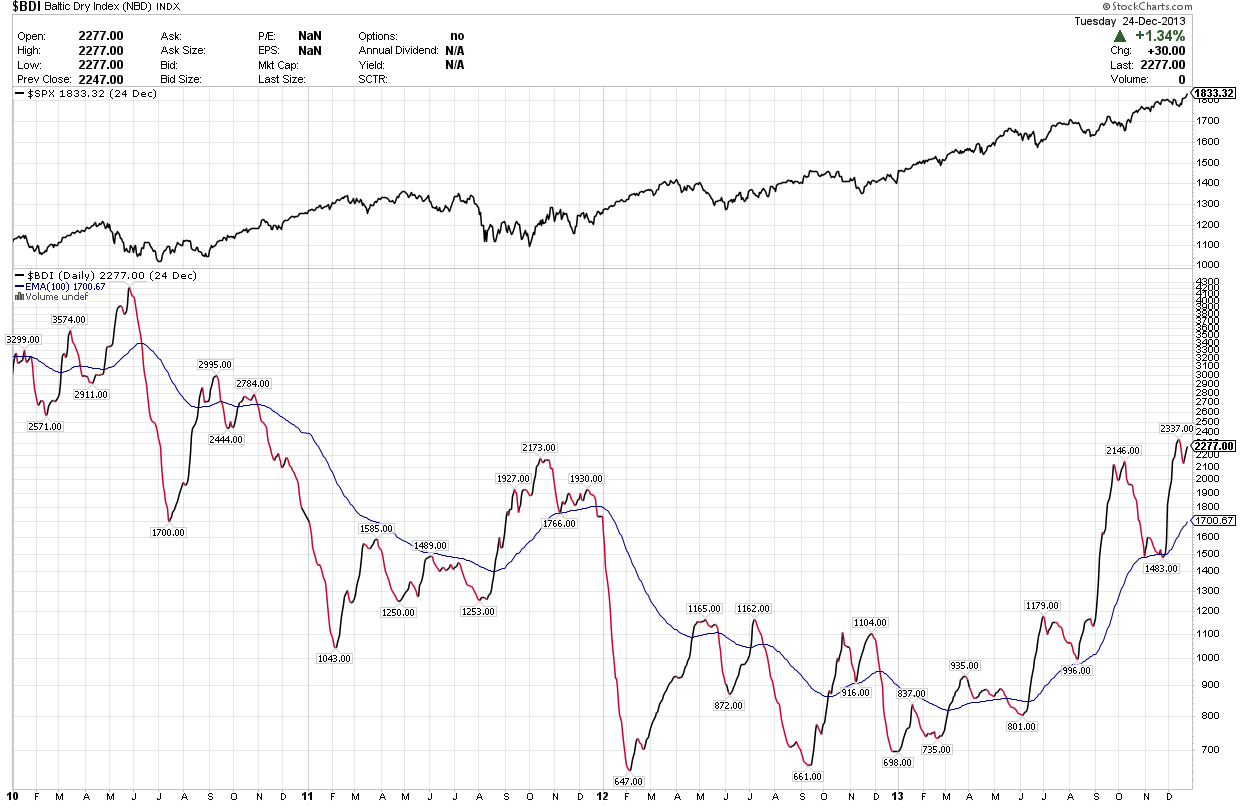 (Please note: I have added a exponential 100-day moving average to these charts which is used as a crossover buy/sell signal for the SPY/S&P 500 index, which is displayed above the BDI chart).