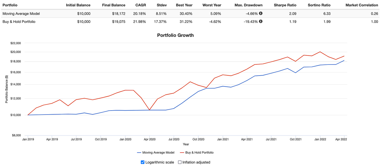 I imported the returns into Portfolio Visualizer and used it with your naïve buy sell algorithm as far back as it went (July 2012). The strategy spends a lot of time out of the market! You can boost returns extending the exponential moving average up to about a year/252 days.
