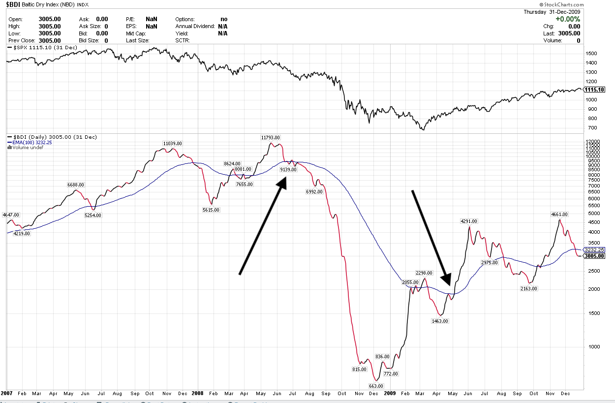 We see here that the BDI signaled “sell” in December 2007, re-iterated that signal in July 2008, and kept you out of the market until around March 2009. Pretty good call: you were in cash during the Great Financial Crisis.